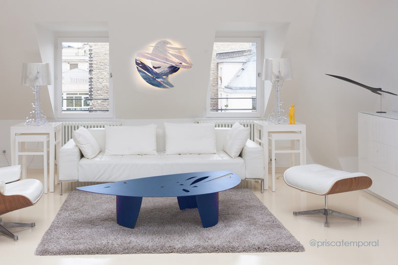 À travers une technique novatrice, Prisca Temporal infuse la peinture directement dans le métal, créant des pièces où la couleur semble émaner de l’intérieur, capturant la lumière et projetant des jeux subtils d’ombres et de reflets. Chaque œuvre devient une fenêtre vers un monde enchanteur, où la peinture prend vie dans la transparence du matériau.